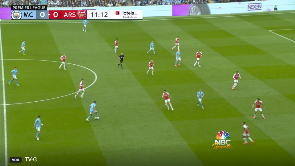 For the first 20 minutes, Arsenal went into a 5-3-2 when City rolled into Arsenal’s half. Havertz and Odegaard held a forward line of two. Rice, Jorginho and Saka sat in a line of 3. Jesus, Kiwor, Saliba, Gabriel and White held down the back line. Jesus and Kiwor are just off camera here in the line of 5 at about the 11th minute.