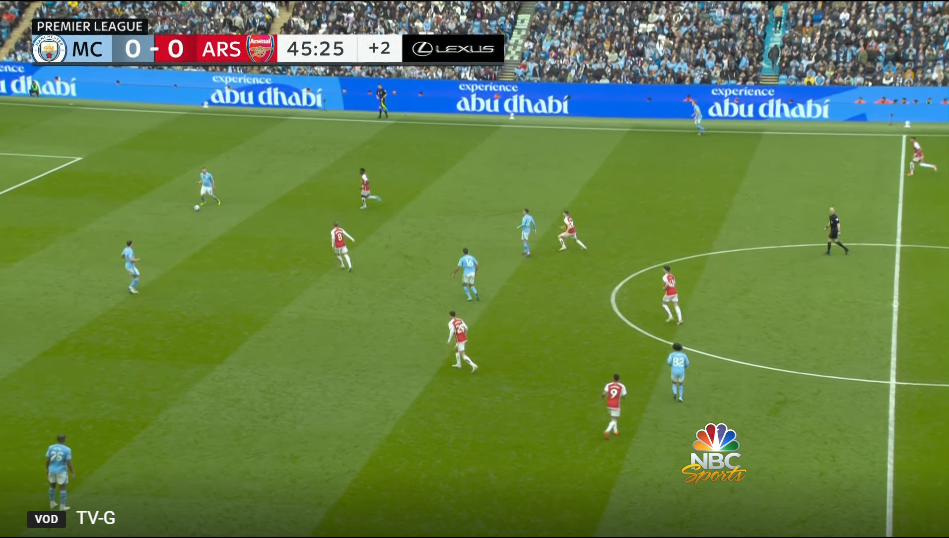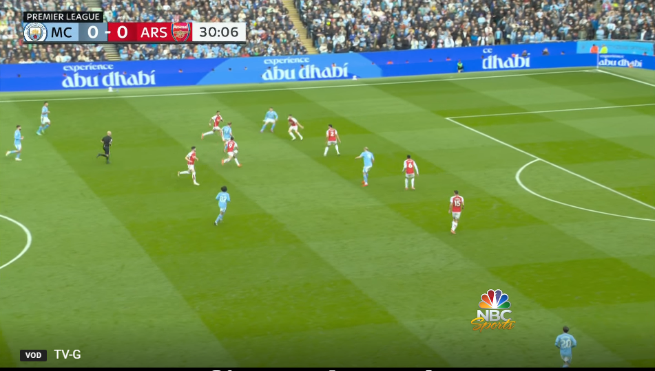 Havertz is anticipating the pass into the middle or to Akanji and it’s Jesus who is sitting in the middle to screen for a ball over the top. Saka’s is pressing high with Odegaard. After City break through this press and go long, we have to scramble defend. Look who’s back making a challenge on the ball and who is not even in the picture again.